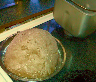 My bread making was not a laborious process of kneading, waiting for it to rise, sprinkling flour all over my floor. Before I went to bed last night I threw a bunch of ingredients into the bread machine and hit the “delay start” button. Hence the wake-up at 5:00 AM with the machine’s quick beeps as it kicked on. By the time I actually rolled out of bed the bread hadn’t baked yet, so I took it out from its last rise cycle and plopped it into a pan (see pic). After a little tinkering, the loaf can then look pretty, and avoids the giant brick effect that most bread machines give to bread.